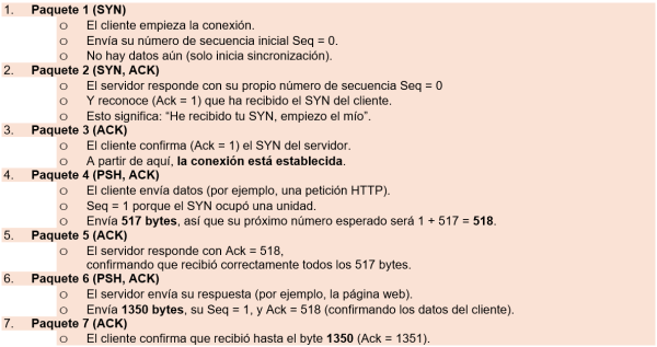 TCP garantiza que los datos lleguen íntegros y en secuencia, para lo cual establece primero una conexión lógica entre cliente y servidor mediante un proceso de handshake de tres vías (three-way handshake).